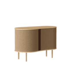 Conçu par le designer Jonas Søndergaard, ce meuble en chêne se distingue par ses portes tambour coulissantes, offrant un accès pratique à son espace de rangement tout en préservant une esthétique épurée.