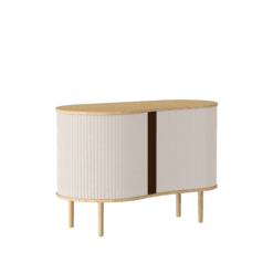 Conçu par le designer Jonas Søndergaard, ce meuble en chêne se distingue par ses portes tambour coulissantes, offrant un accès pratique à son espace de rangement tout en préservant une esthétique épurée.