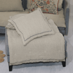 Chaque pièce présente une finition frangée et un point de khanta, avec une face en lin lavé de 330 gsm pour une élégance naturelle, et l’autre en coton pour une touche de douceur supplémentaire.