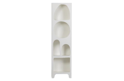 Cette étagère est entièrement conçue en contreplaqué blanc. Elle est équipée de quatre étagères présentant des ouvertures de tailles variées.