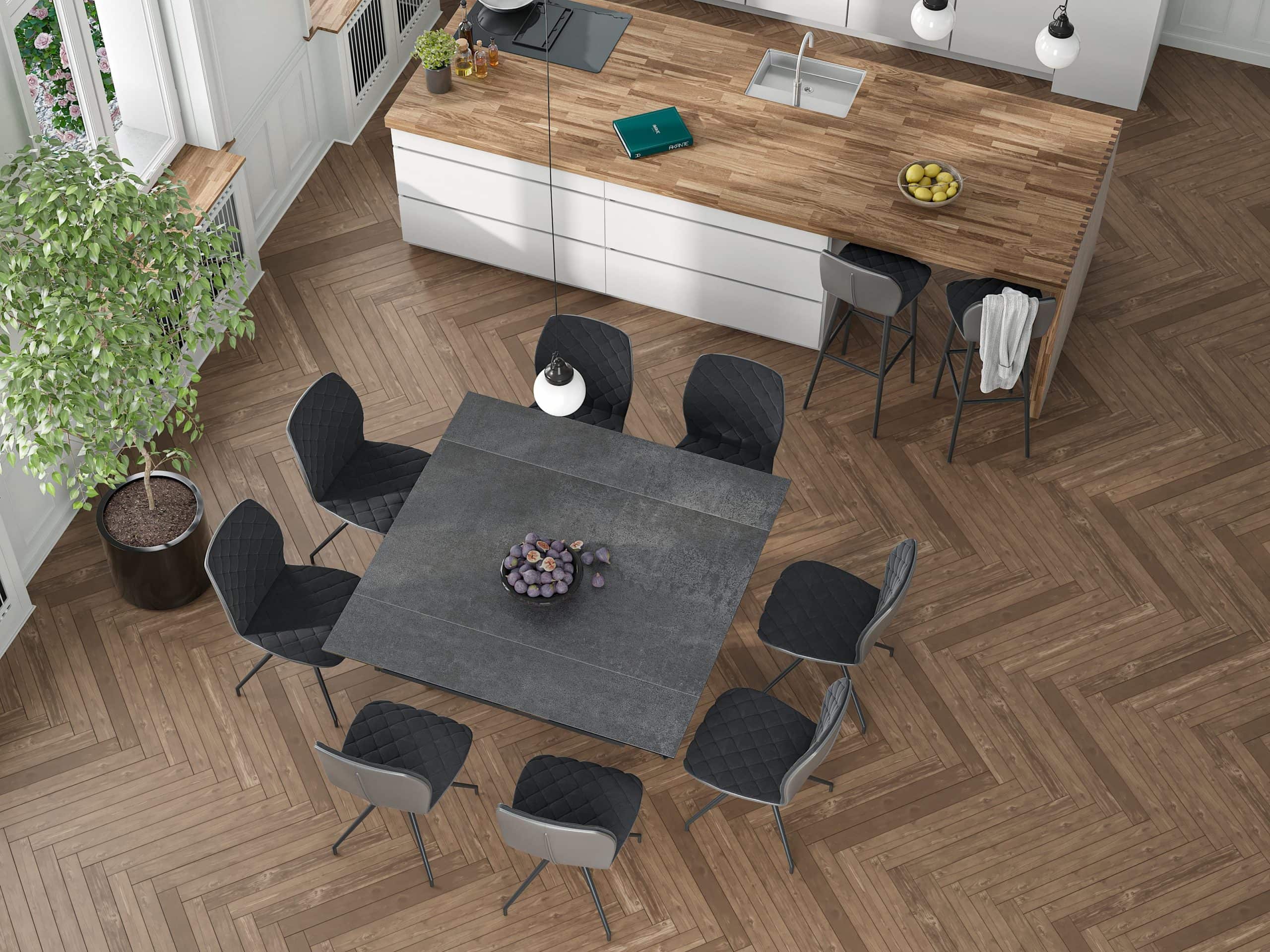 La table de repas FASCINATION est unique. Elle loge sous son plateau, deux rallonges latérales qui une fois déployée permettent d’accueillir aisément jusqu’à 10 couverts.